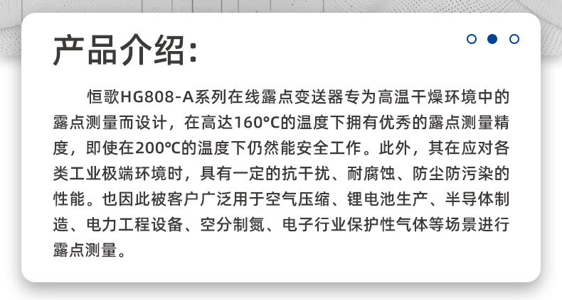 恒歌HG808-A系列在線露點(diǎn)變送器專為高溫干燥環(huán)境中的露點(diǎn)測量而設(shè)計(jì),在高達(dá)160°C的溫度下?lián)碛袃?yōu)秀的露點(diǎn)測量精度,即使在190°℃的溫度下仍然能安全工作。此外,其在應(yīng)對各類工業(yè)極端環(huán)境時(shí),具有一定的抗干擾、耐腐蝕、防塵防污染的性能。也因此被客戶廣泛用于空氣壓縮、鋰電池生產(chǎn)、半導(dǎo)體制造、電力工程設(shè)備、空分制氮、電子行業(yè)保護(hù)性氣體等場景進(jìn)行露點(diǎn)測量。