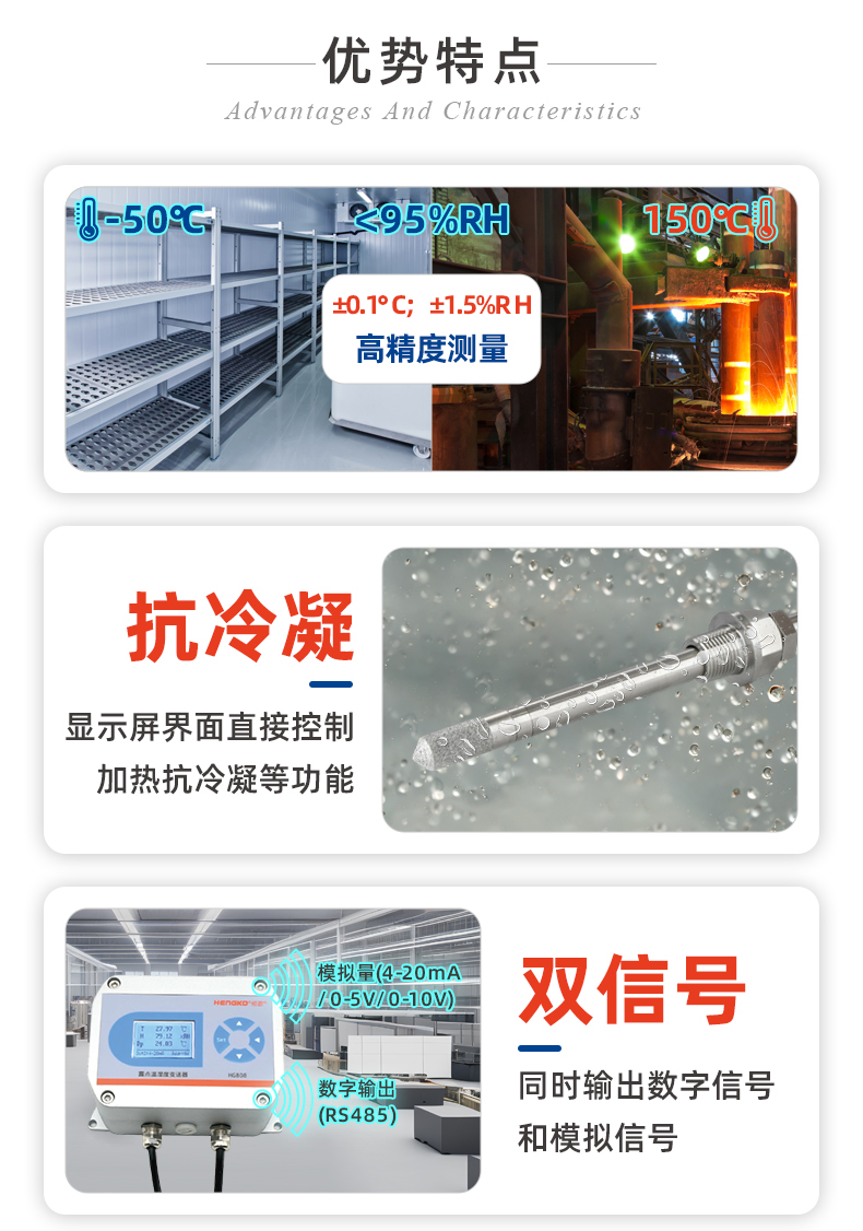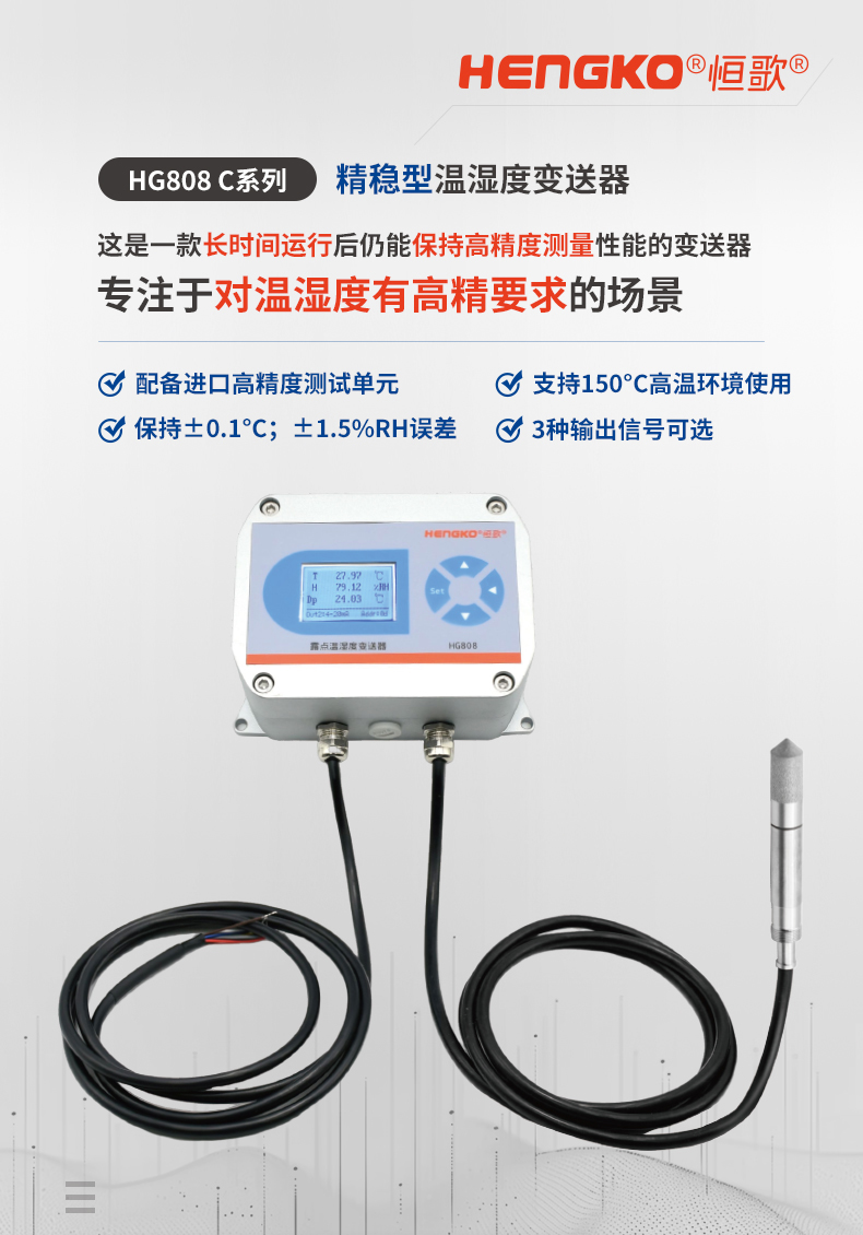 恒歌808-C系列是一款專為溫濕度有高測量要求的場景研發(fā)的精穩(wěn)型溫濕度變送器,通過采用高精度傳感器和先進的校準技術(shù),使變送器在0~100%RH及?-50°C~+150°C測量范圍內(nèi),典型精度可達±1.5%及±0.1℃,確保了設(shè)備在長時間運行后仍能保持高精度測量性能。也基于其精穩(wěn)型特點,設(shè)備被廣泛應(yīng)用在生物制藥、精密機械加工、實驗室研究、食品加工與儲存等多個領(lǐng)域。