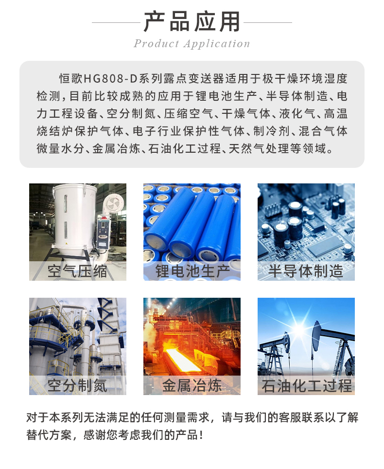 HG808-D系列在線露點(diǎn)測(cè)量?jī)x結(jié)合了高品質(zhì)濕敏元件和先進(jìn)校準(zhǔn)技術(shù),非常適用于極干燥環(huán)境的露點(diǎn)測(cè)量,露點(diǎn)范圍涵蓋-60~90°℃,并且實(shí)現(xiàn)+2°℃ Td高精誤差。也正因變送器在干燥環(huán)境下對(duì)微水靈敏的感知能力,常被用于需要對(duì)環(huán)境濕度進(jìn)行精確控制的場(chǎng)合,,例如鋰電池研究生產(chǎn)、半導(dǎo)體應(yīng)用、壓縮空氣干燥設(shè)備出氣口、手套箱微水檢測(cè)等場(chǎng)景。